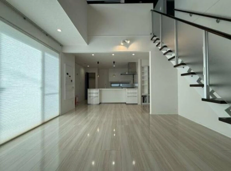 オール電化+太陽光発電の省エネ住宅。LDK20帖超の吹抜けリビングが開放的。